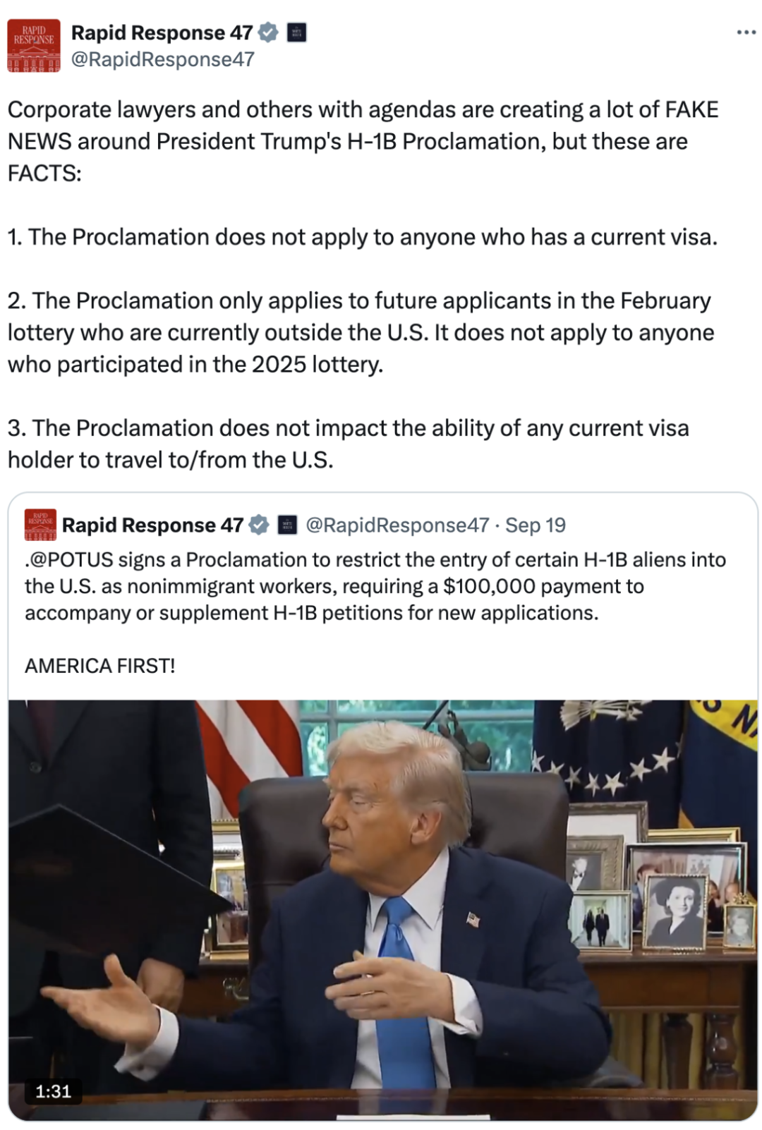 在总统行政令签署当天,由于公告措辞模糊,很多人误以为所有H-1B持有人都要缴纳10万美元,甚至包括那些已经获批、但暂时在美国境外的人。