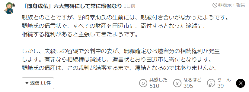 也有网友友情提示,别忘了还有须藤早贵,她要是二审再无罪,可是享有法定特留份的继承权的。
