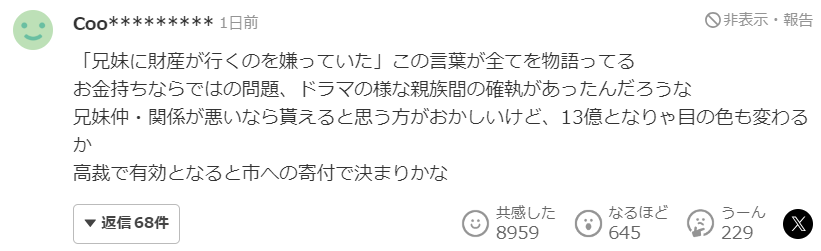 如果兄妹之间的关系本来就很差,那觉得自己能继承遗产才奇怪吧。不过涉及到13亿日元,恐怕谁都得动心了。