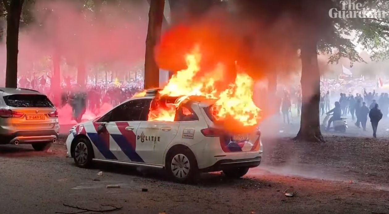 当地时间20日,荷兰爆发反移民抗议活动,一辆警车被纵火焚烧。图源:英媒视频截图