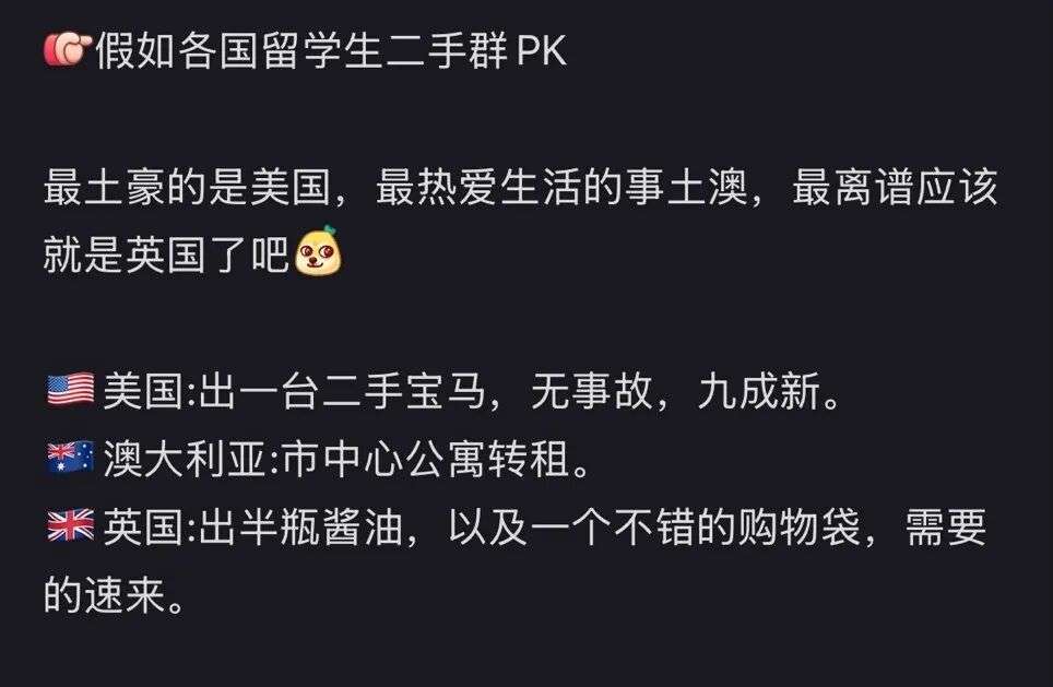 每个国家的二手群都极具特色:美国的留子爱出二手车,澳洲的留子爱出短租,而英区的留子喜欢搞抽象,他们爱出离谱。