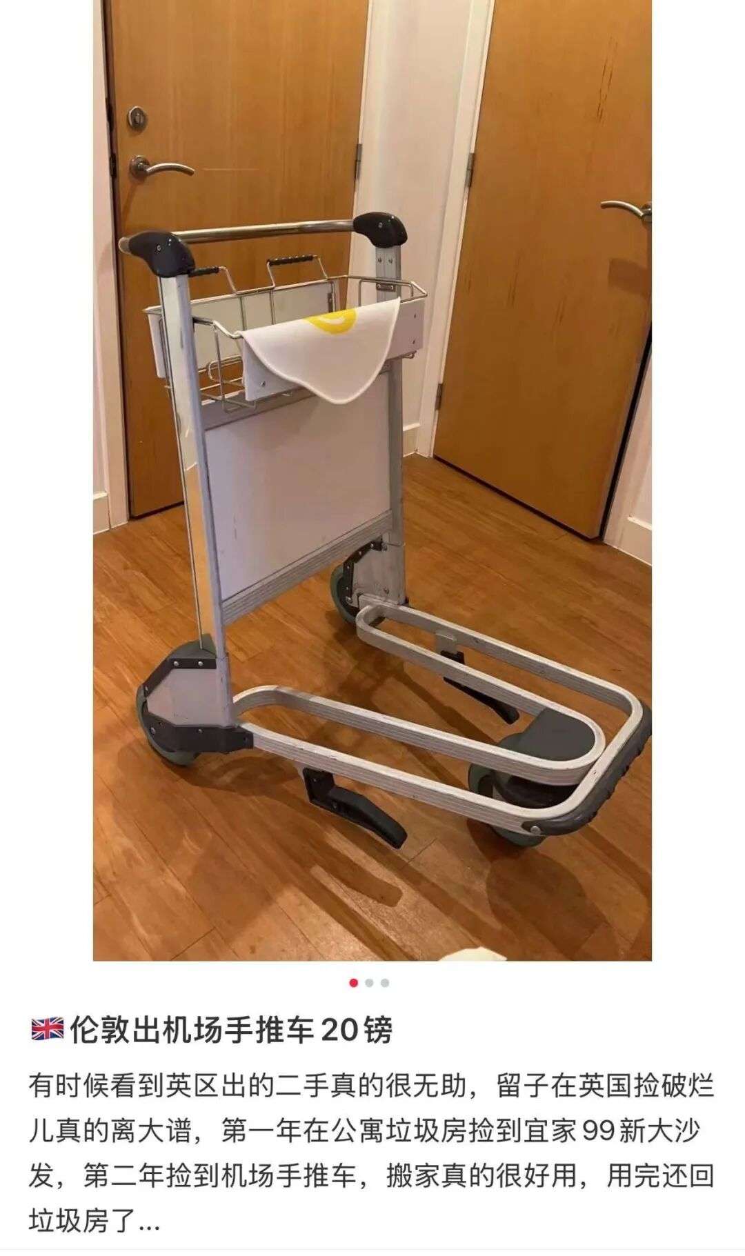 机场的手推车是怎么被“带”回家的,咱也不敢说,咱也不敢问,这种不属于自己的物品就这么明目张胆地拿出来卖二手,请问这位卖家您经过机场的允许了吗?今天敢卖机场的手推车,明天就敢卖飞机的引擎。