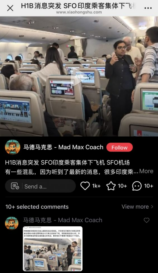 旧金山国际机场出现旅客临时改签、滞留与下机后再次登机的混乱:有报道指,许多前往印度的H1B签证持有者在得知H1B签证费用高达10万美元后纷纷下飞机,导致航班延误3小时。许多印度乘客显然是在接到雇主的电话,要求他们不要离开美国后才下机的。”