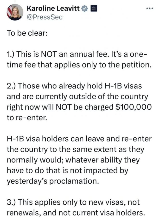 白宫新闻秘书随后对外澄清称,该费用为一次性(per petition)而非年度征收,并不适用于已提交或已获批准的申请,也不追溯适用于现有持证者。美国公民及移民服务局(USCIS)和国土安全部被指示据此调整执行细则,但细节尚在制定中。