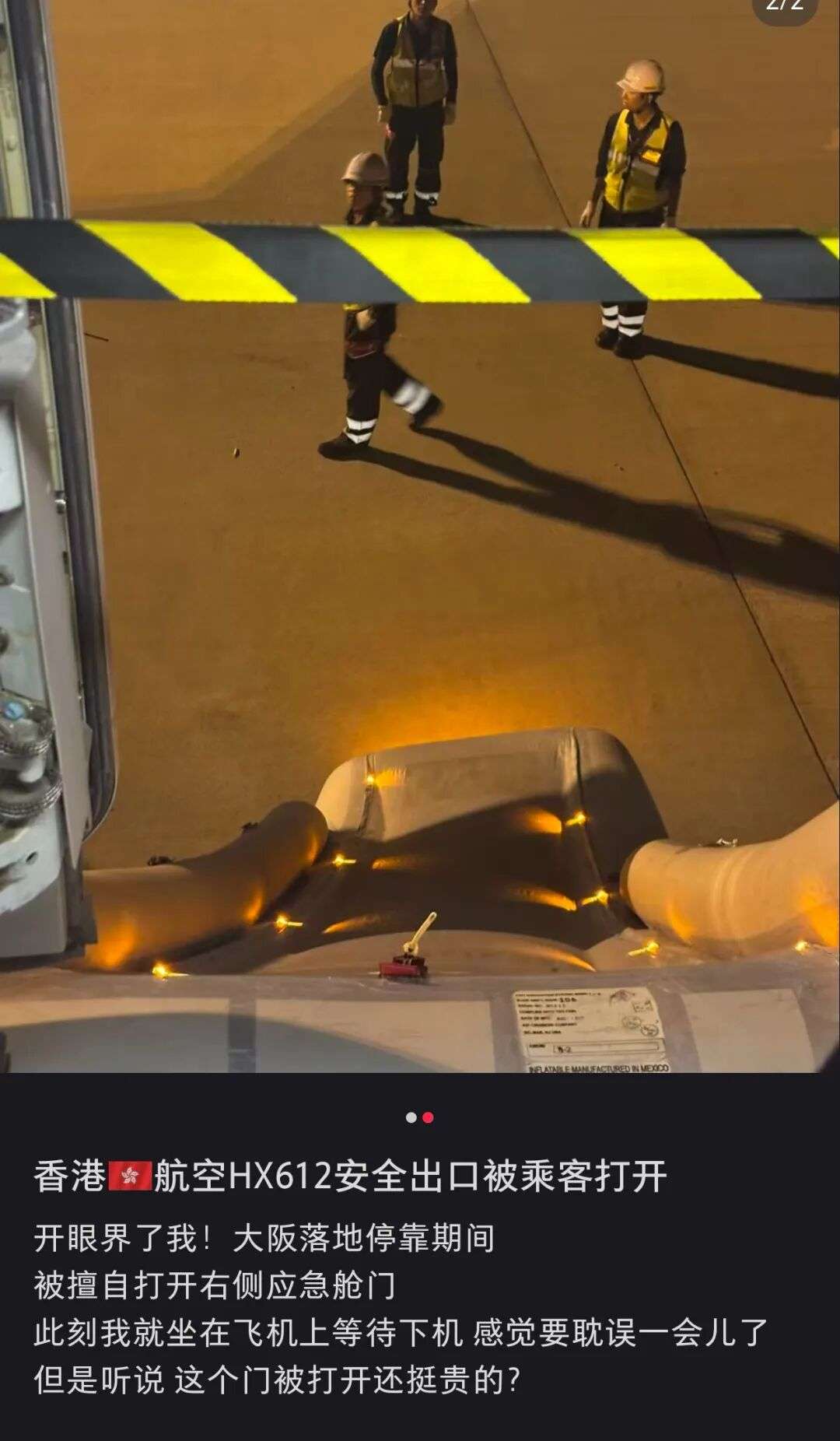 9月21日,有网友在社交平台爆料,称乘坐的香港飞大阪的HX612航班落地关西机场后,有乘客擅自打开右侧应急舱门,导致应急滑梯被放出 。