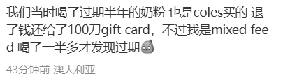 更有华人称,曾无意给孩子喝过已过期半年奶粉,同样是在Coles购买,最终虽获退款和100澳元礼品卡补偿,但事件本身已暴露了严重的安全隐患。