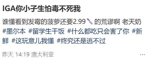 就在前段时间,还有华人发现当地IGA超市竟将已发霉变质的菠萝贴上促销标签继续售卖,原价4.99澳元,折价后仍标价2.99澳元。