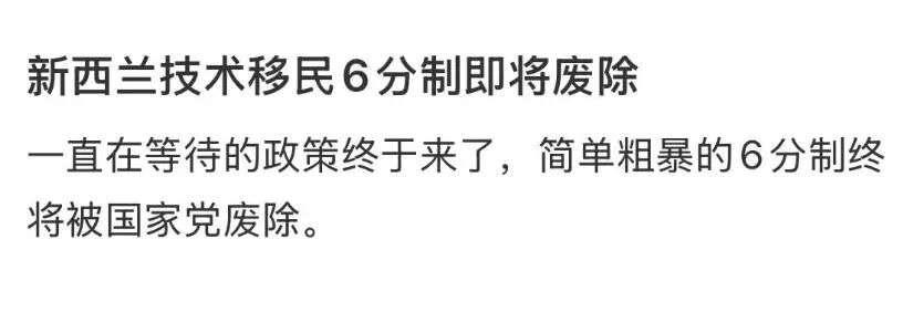 有华人中介表示,今天的发布实际上意味着新西兰废除了现行的6分制移民体系。