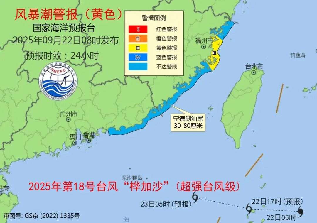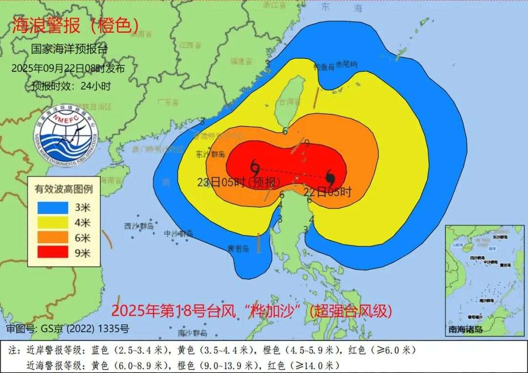 海浪方面,受今年第18号台风“桦加沙”(超强台风级)的影响,预计9月22日上午到23日上午,巴士海峡、南海东北部将出现8到13米的狂浪到狂涛区,台湾海峡将出现4到6米的巨浪到狂浪区,近海海域海浪预警级别为橙色;广东东部、福建南部近岸海域将出现2.5到3.8米的大浪,该近岸海域海浪预警级别为黄色,福建北部、浙江南部近岸海域将出现2到3米的中浪到大浪,该近岸海域海浪预警级别为蓝色。请在上述海域作业的船只注意安全,沿海各有关单位提前采取防浪避浪措施。