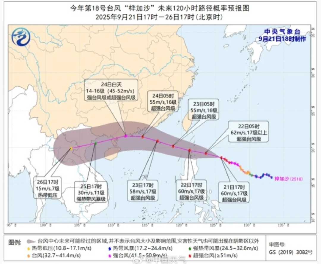 此前,据@珠海气象,“桦加沙”一出生就非同凡响,9月20日02时就加强为台风级,体型面积超过了整个广东省。不过进入南海后,预计它的体型将有所收缩,能量高度集中在台风眼区。