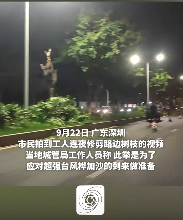 据澎湃新闻,9月21日,广东深圳。多名工人连夜修剪路边树枝。南山区城管局工作人员称,此次台风“桦加沙”风力较大,或登陆深圳,提前修剪树冠防止树木“头重脚轻”被刮倒。据深圳城管,台风“桦加沙”来临前,城管部门对全城树木进行加固、修剪。