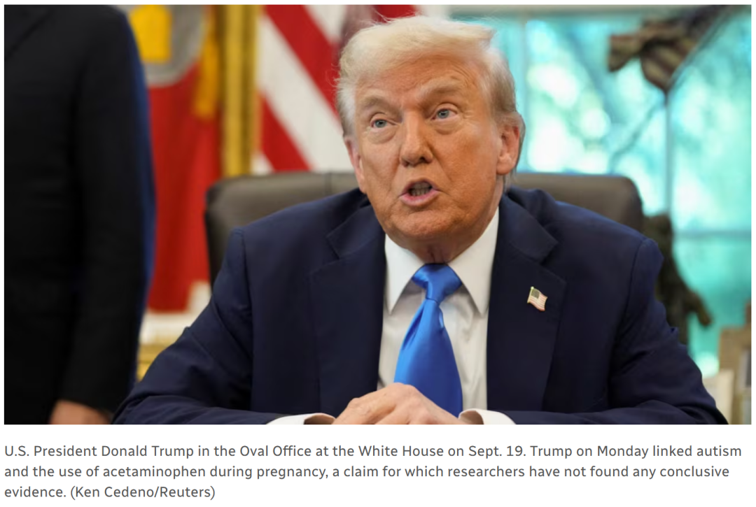 特朗普还特别提到,每次孩子接种疫苗时不应该给孩子服用泰诺。他宣布美国食品药品监督管理局(FDA)将开始告知医生,孕期使用泰诺可能与“极大增加的自闭症风险”有关。