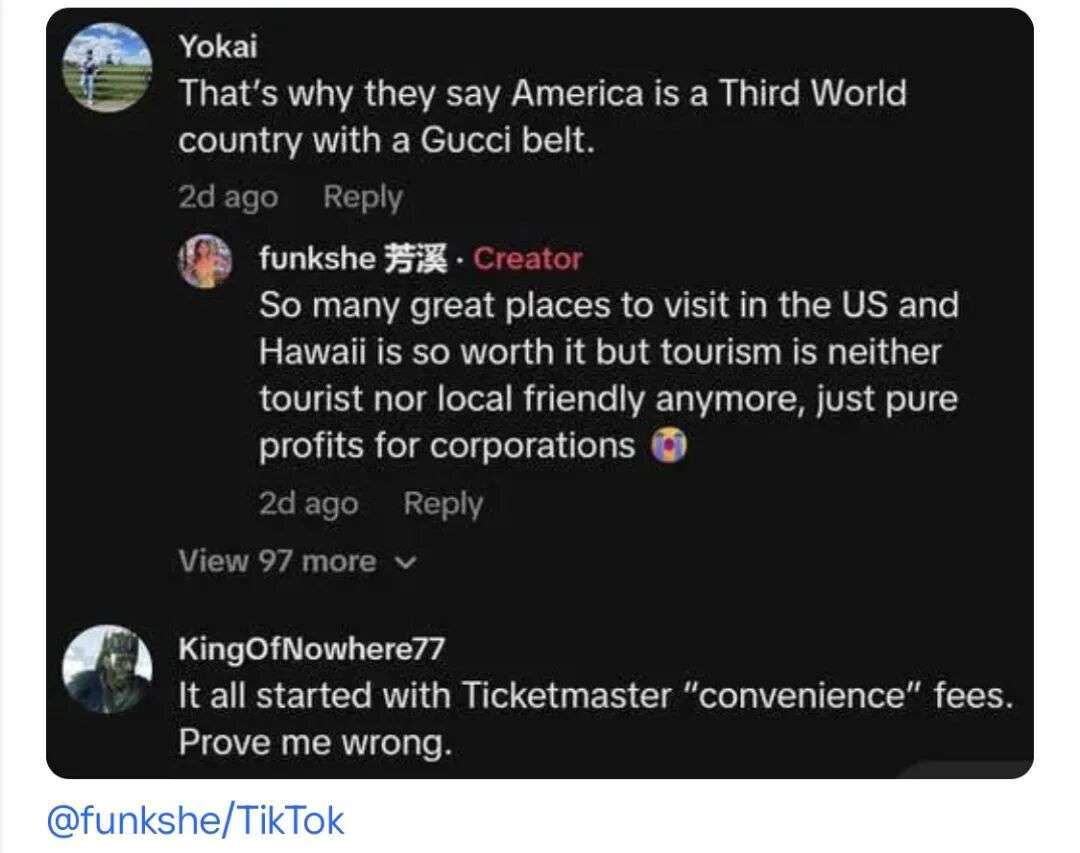 网友@seandekodaphillip则说,“(美国)旅游量正在下滑,他们正在收割任何有能力去的人。”