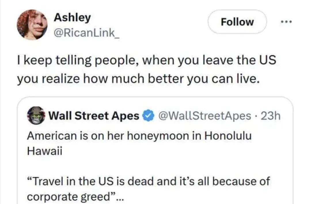 网友@RicanLink_/X:“我一直告诉大家,当你离开美国时,会意识到自己可以活得多好。”