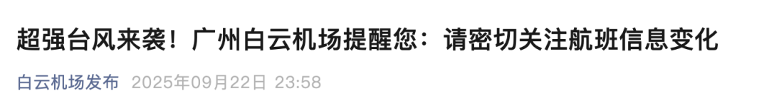 白云机场发布提醒,9月23日至25日将受台风暴雨严重影响。白云机场航班可能会出现不同程度的延误,航班动态将密切监控。