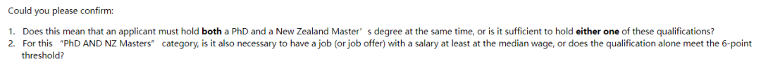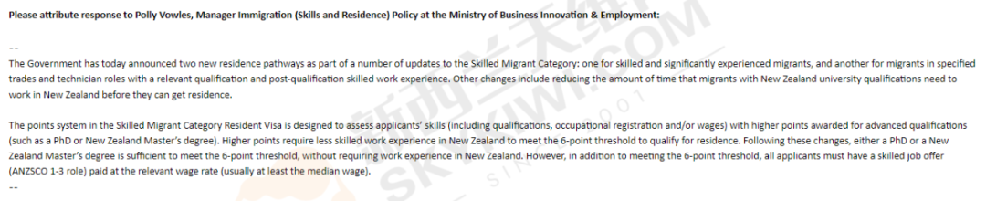 新西兰商务创新与就业部(MBIE)移民(技能与居留)政策经理 Polly Vowles明确表示:“在本次调整后,博士或新西兰硕士学位任一即可直接满足6分门槛,无需额外的新西兰工作经验。”