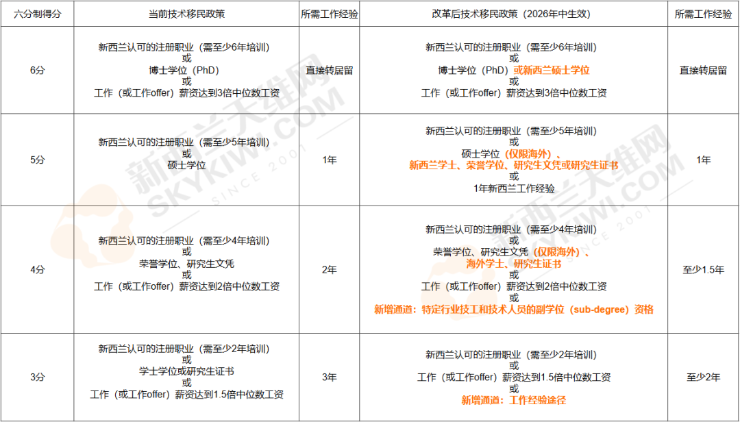 当前技术移民六分制与改革后新政策对比,标橙为改动部分。本表格仅作参考,具体政策以新西兰移民局官网为准