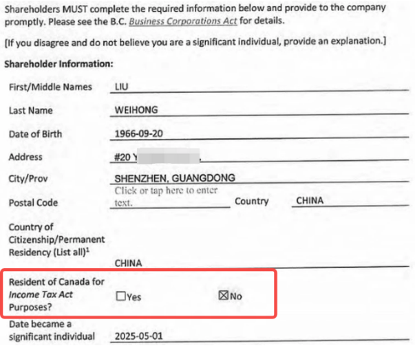 相反,在BC省新的透明度登记册中,当被要求列出“国籍/永久居留国”时,刘伟宏只写了一个答案:中国。