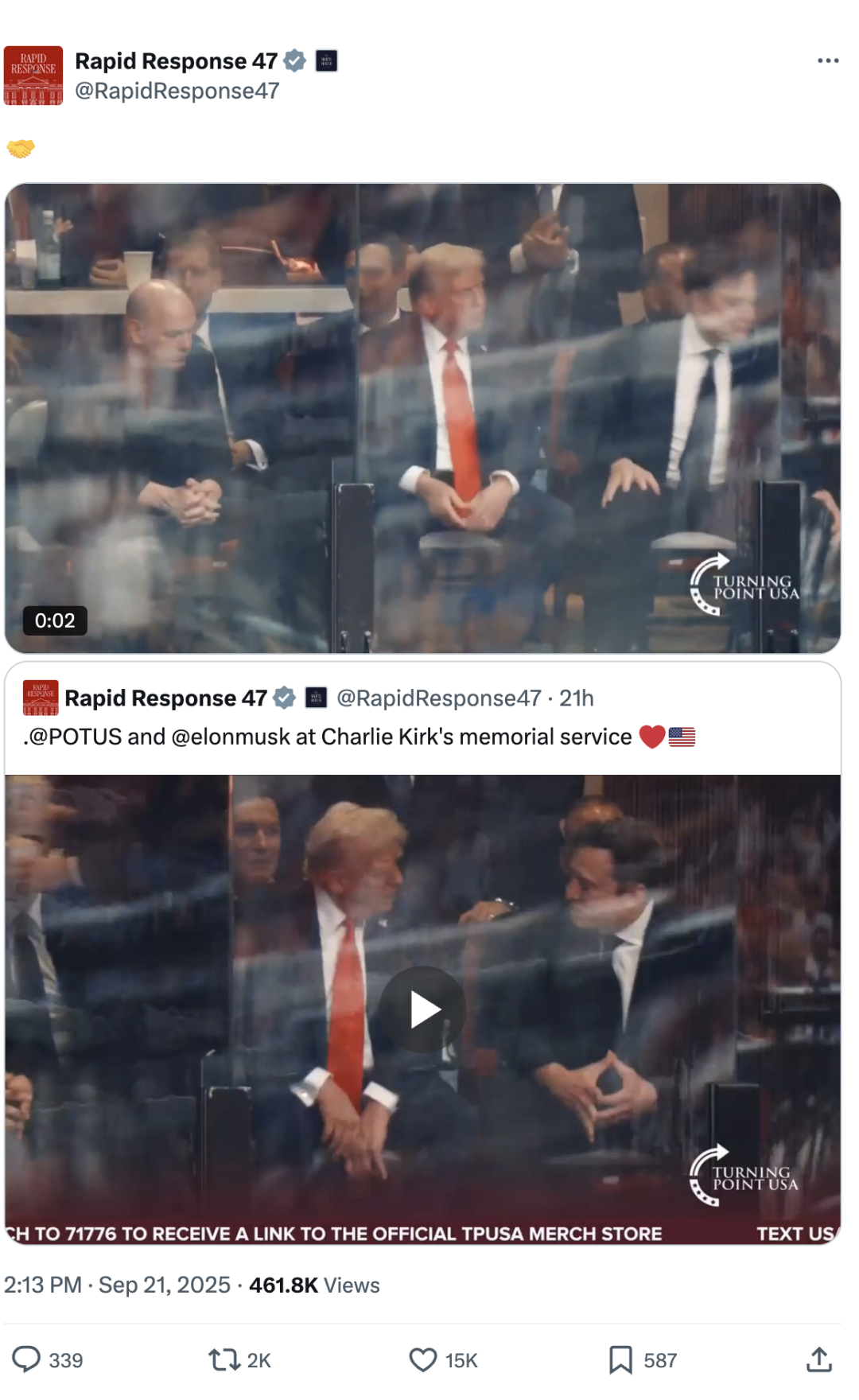 如今,在柯克的追思会上,特朗普与马斯克的“世纪握手”,似乎让这段关系迎来新的转折点。