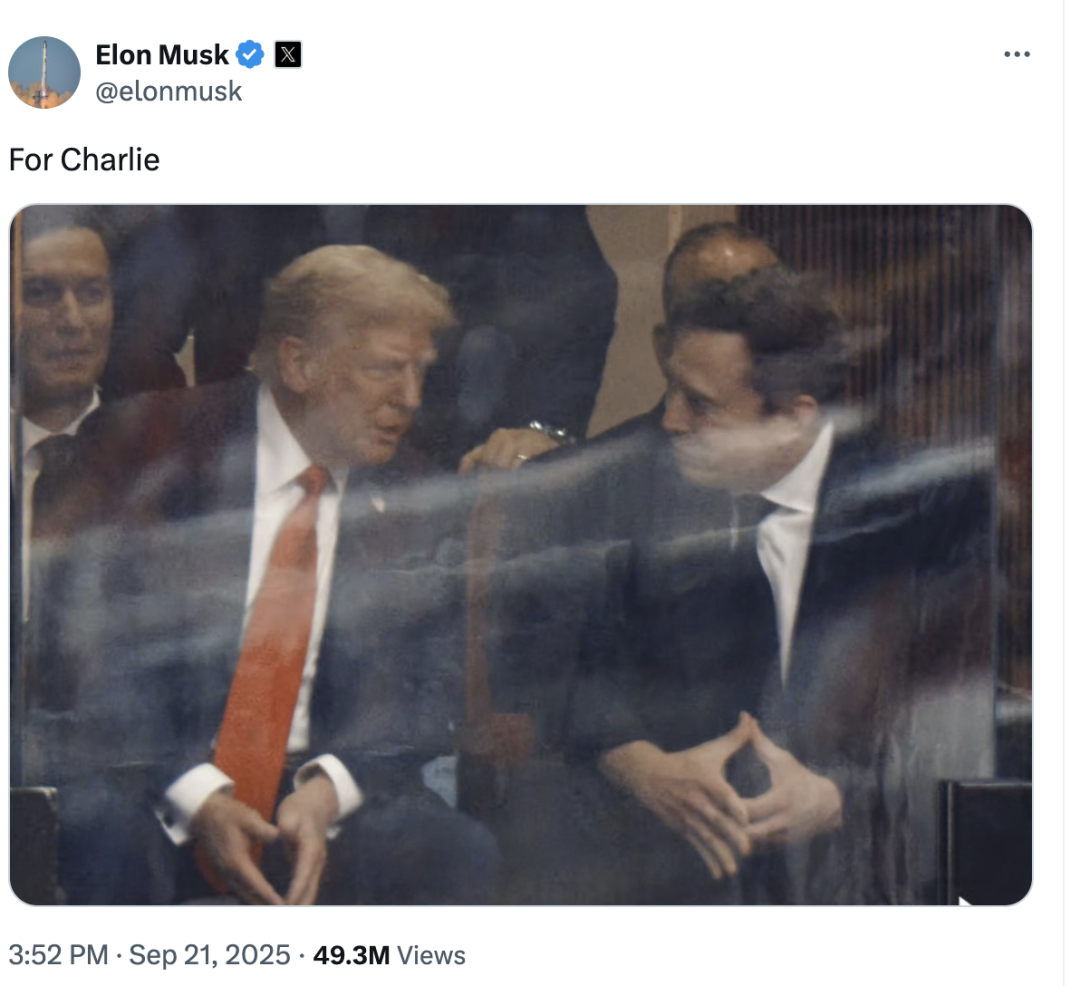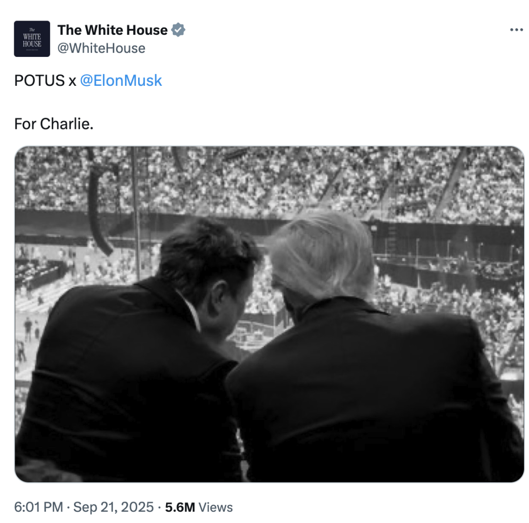 白宫当天也在X平台晒出两人背影黑白照片,特别@了马斯克,并写下“献给查理”For Charlie),似乎向外界释放马斯克与特朗普“破冰”的信号。