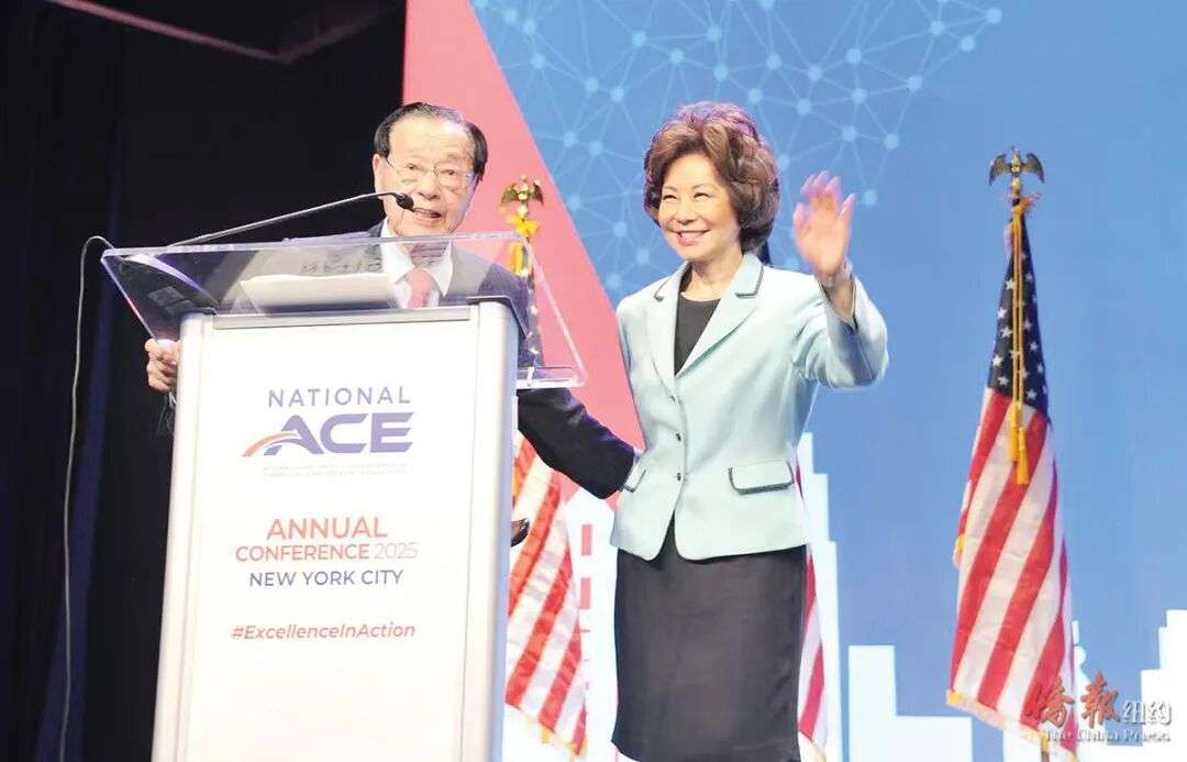 当地时间9月19日,全美亚太裔总商会在纽约举办年会,赵锡成在女儿赵小兰陪同下领奖。(图源:美国侨报)