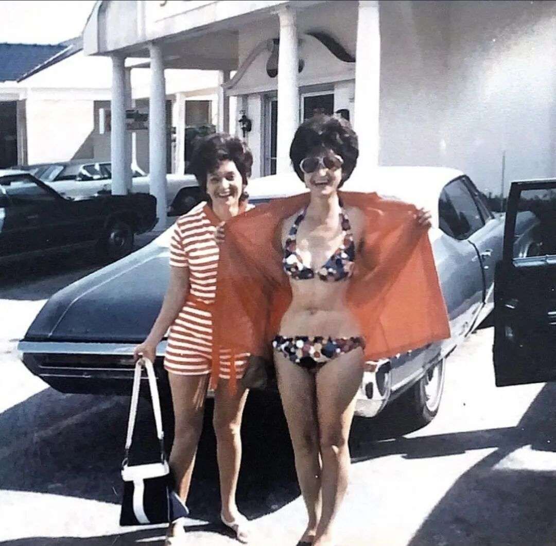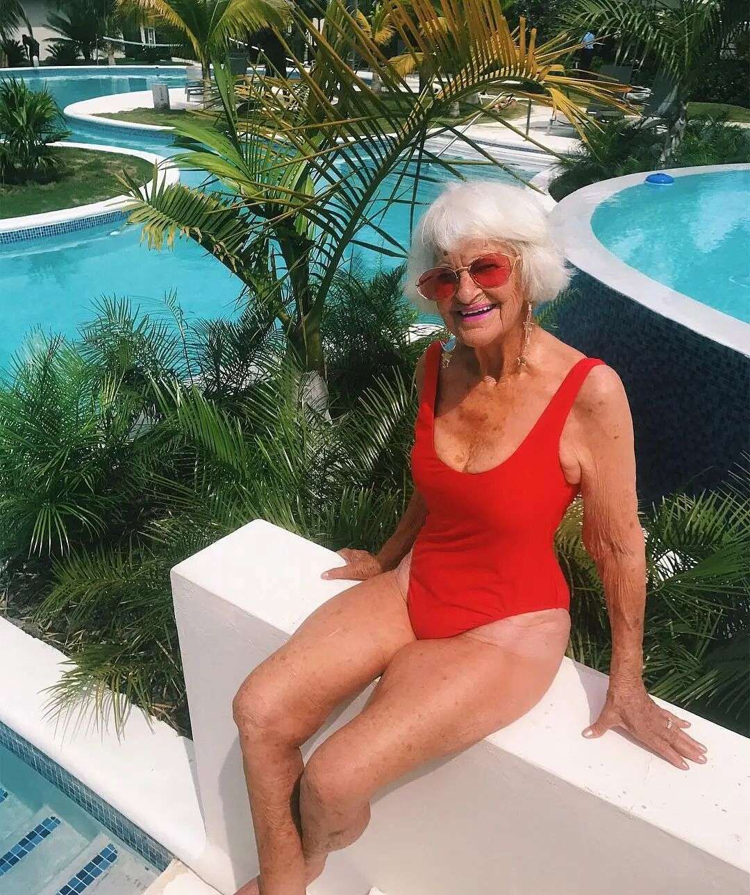 她在泳池边穿着低胸泳衣,一点也不介意在热辣的阳光下裸露她布满斑点和皱纹的皮肤。
