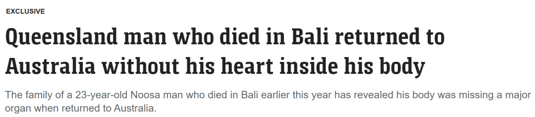 近日,一名在巴厘岛死亡的澳洲游客的家人震惊地发现,在儿子的遗体被运回国内时,心脏竟已被移除。