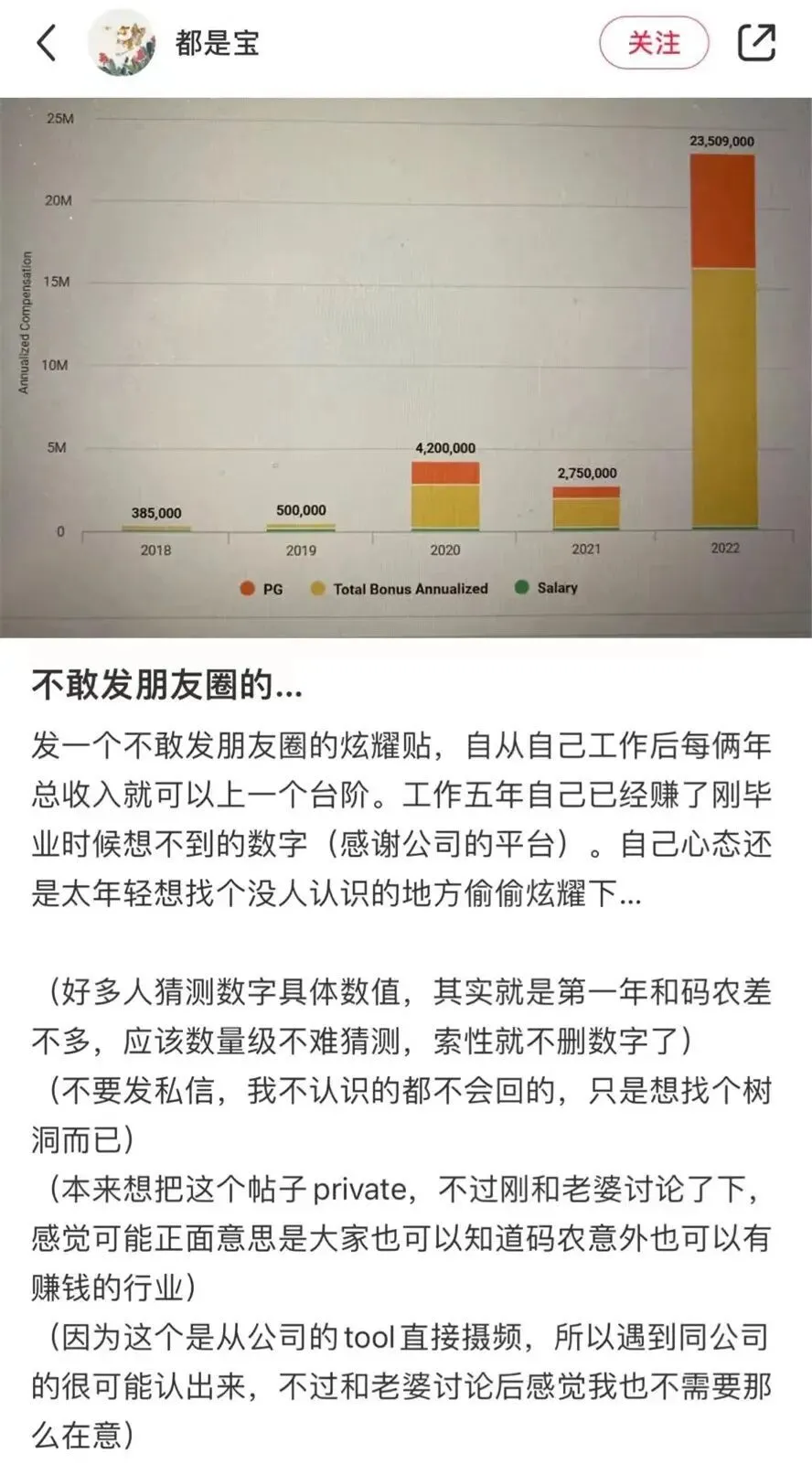这则帖子出现在社交平台上,内容让人忍不住瞠目结舌: 一张清晰的收入柱状图,显示从2018年几十万美元,到2022年竟飙升至 23,509,000 美元。