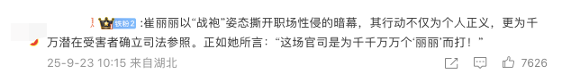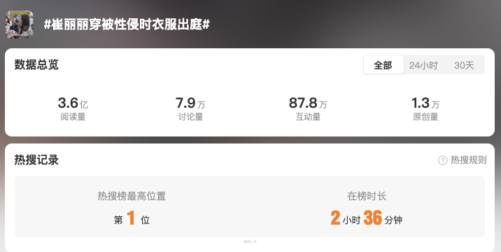 9月23日,#崔丽丽穿被性侵时衣服出庭# 冲上热搜第一,话题阅读量高达3.6亿。