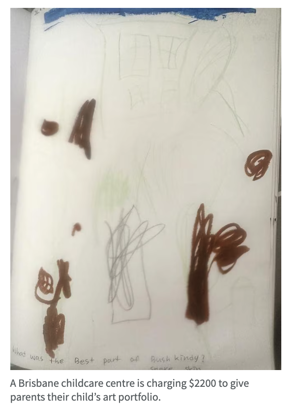 事情发生在布里斯班北区的Craigslea幼儿园。因为长期欠债,这家幼儿园突然通知家长:孩子的作品集要价2200澳元,否则不给带回去。更离谱的是,有位妈妈偷偷把孩子的画拿回家,还被园方报警说是“入室盗窃”。不少家长直呼:“这是抢钱吧!”