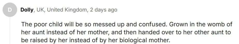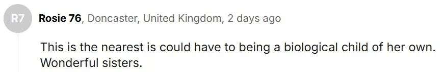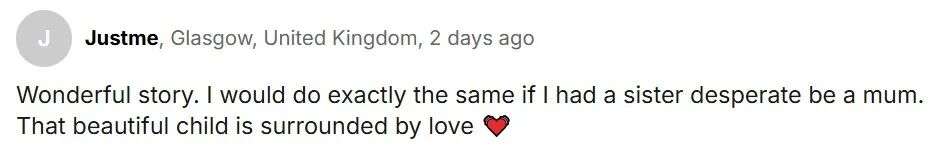 “真是个美好的故事。如果我有个渴望当母亲的姐姐,我也会为她做一样的事。这个漂亮的孩子被满满的爱所包围。”