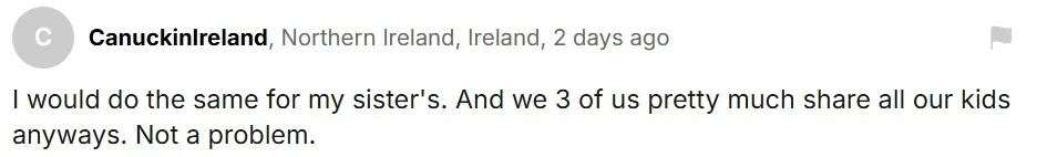 “我也会为我的姐妹们做同样的事。而且我们三个人基本上孩子都一起带,完全不是问题。”