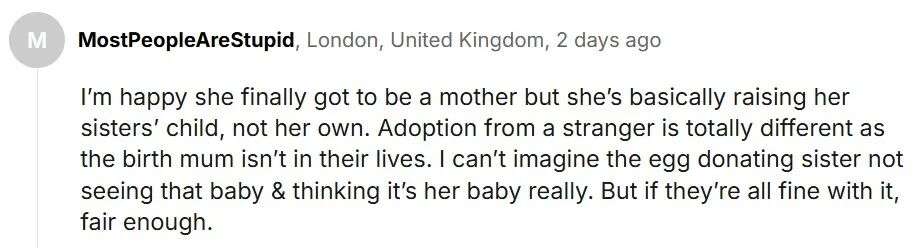 “我很高兴她终于当上了母亲,但说到底,她其实是在抚养自己姐妹的孩子,而不是自己亲生的。这和收养陌生人的孩子完全不同,因为孩子的生母不会参与他们的生活。很难想象捐卵的小妹见到宝宝时,心里不会认为‘那是我的孩子’。不过如果她们都能接受,也没问题。”
