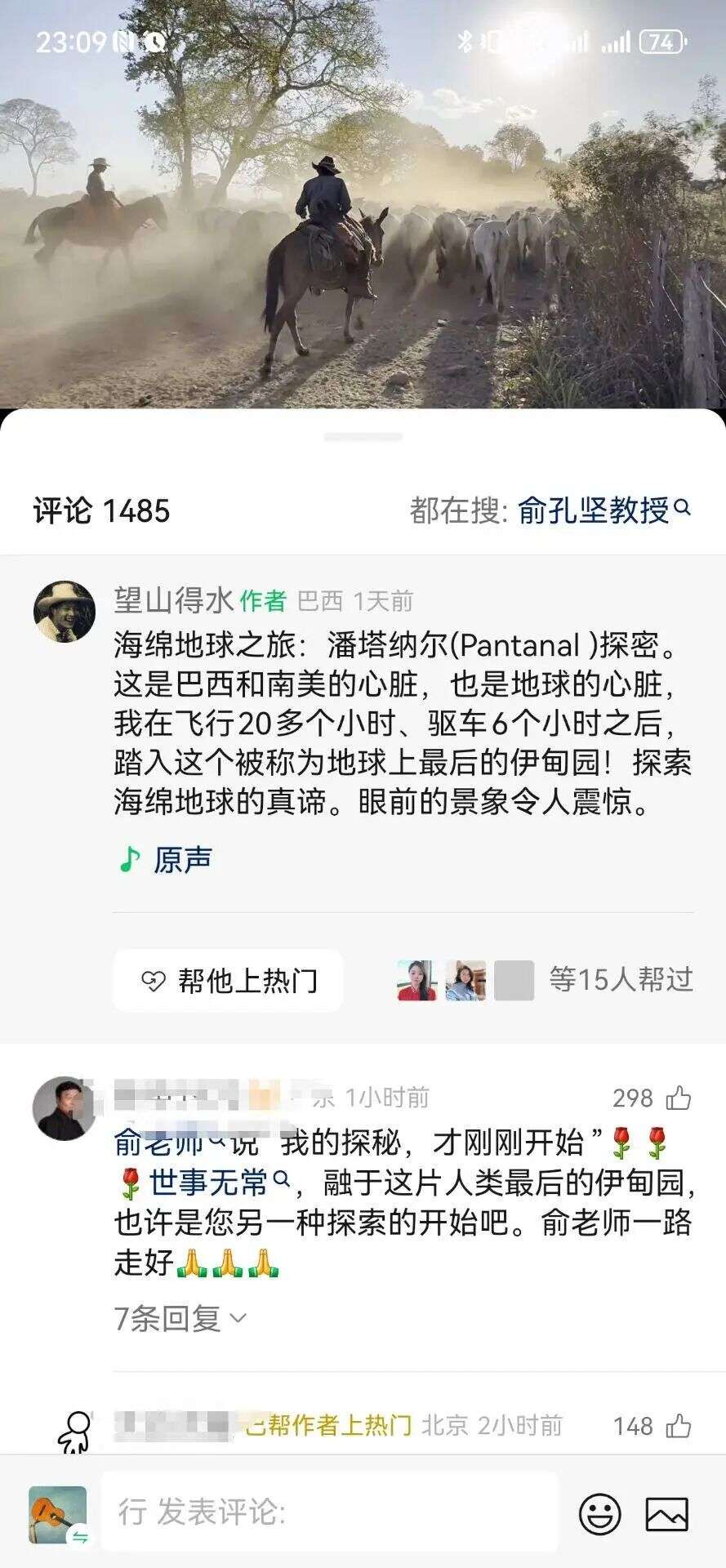 不少网友在这段视频的评论区悼念俞孔坚:“他的激情与无畏,曾给无数景观学子在迷茫道路中带来慰藉。”“生命定格在世界最大的天然湿地,海绵星球的先行者,一路走好。”