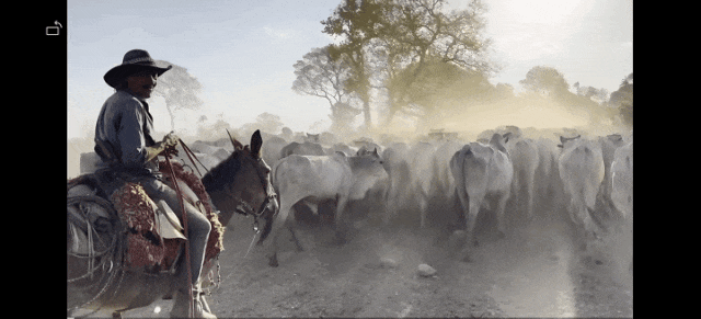 随着夕阳下牛仔驱赶上千头牛群的画面出现,俞孔坚解说到,牧场正一点点吞噬这片水乡。曾经是无数动物的天堂的湿地,如今已经被围栏切割,被牧场取代。这里表面宁静,却暗藏危机。“尘土与余晖交织成一幅壮丽而悲怆的画卷,这片乐园正悄然改变。”