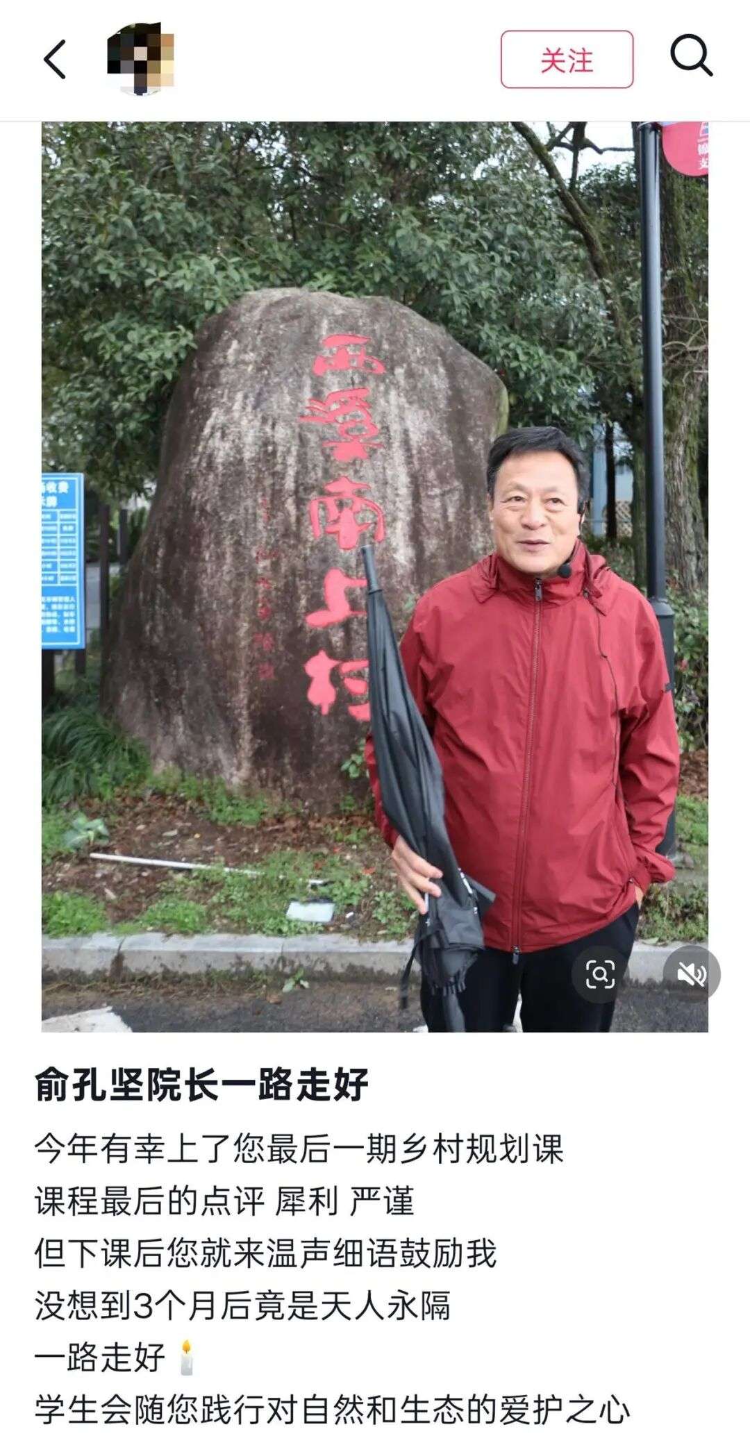 一位俞孔坚教授的学生悲痛发文:“今年有幸上了您最后一期乡村规划课。课程最后的点评、犀利、严谨,但下课后您就来温声细语鼓励我。没想到3个月后竟是天人永隔。一路走好。学生会随您践行对自然和生态的爱护之心。”