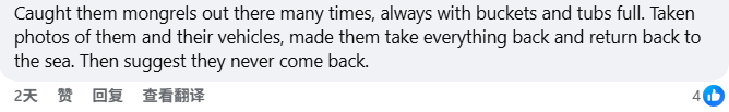 “遇到过这些杂种好多次,每次把桶和盆装得满满。我把他们和车都拍下来了,让他们把贝全部放回海里,告诉他们再也别来了。”