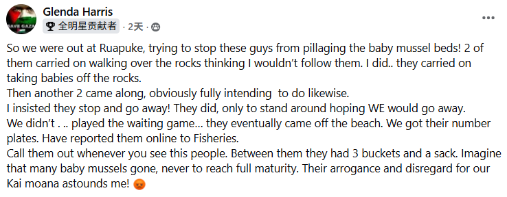 “大家看到这种情况,一定要当场指出!想想看,这么多小青口就这样被拿走,再也无法长大成熟。他们的傲慢和对我们Kai moana(毛利语:海鲜资源)的漠视,真让人气愤!”