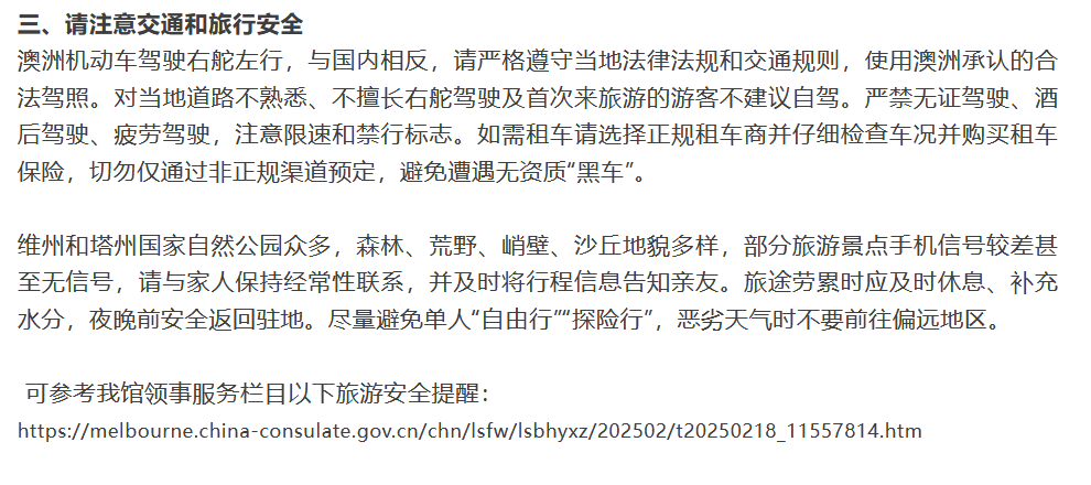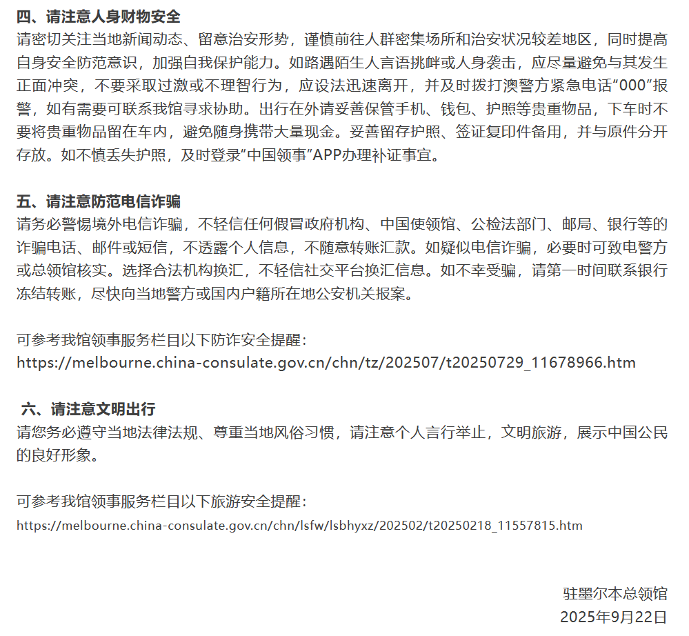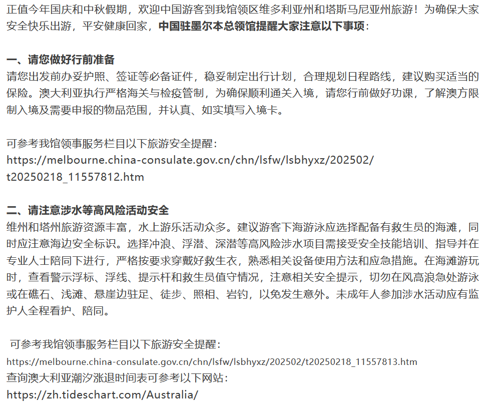 中国驻墨尔本总领馆提醒中秋、国庆假期领区中国游客注意旅行安全。