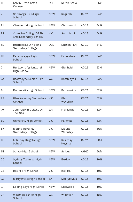 昆州:除了“科数学院”(79%),第二名是Indooroopilly(59%),再往下就是Brisbane State High(58%)和Kelvin Grove(55%)。