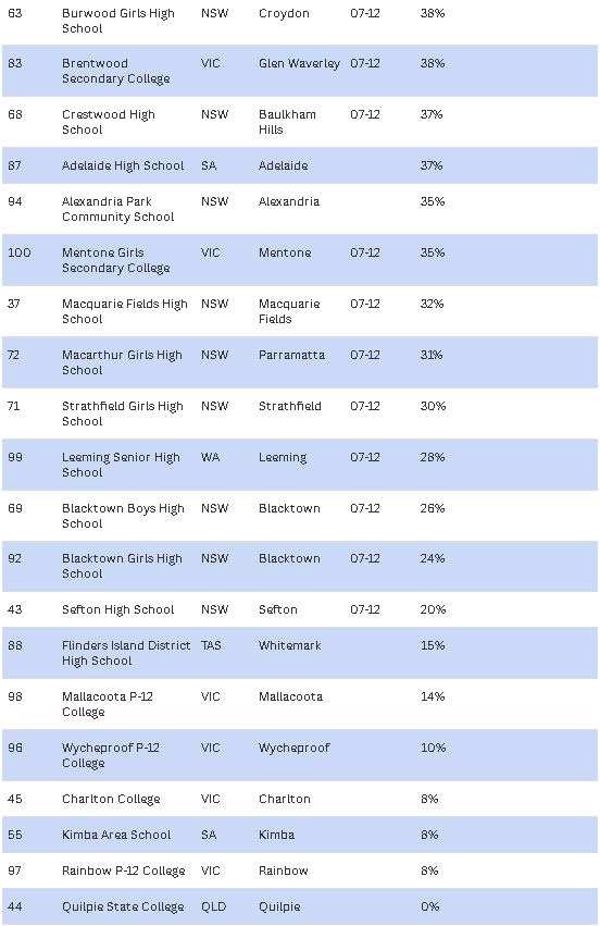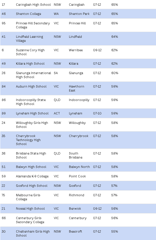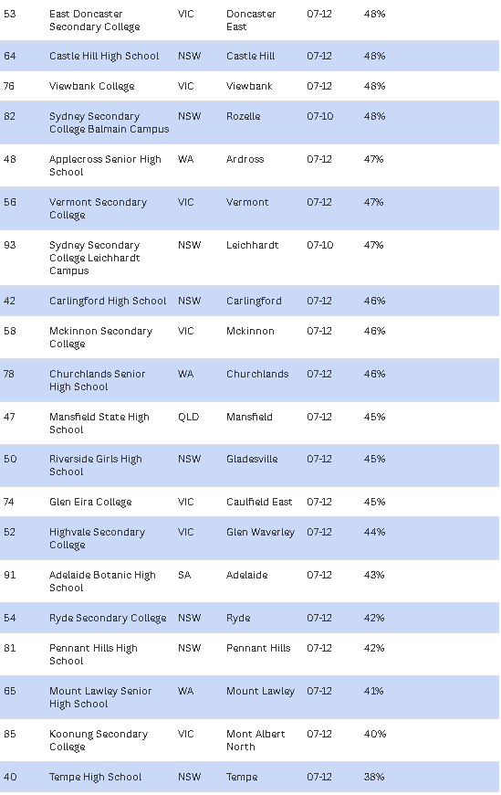 堪培拉:Telopea Park(67%),Lyneham High(59%),Alfred Deakin(53%)。