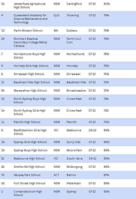 紧随其后的是 Queensland Academy for Science, Maths and Technology(QLD)、Perth Modern(WA)、Manly Campus(NSW),都有79%。