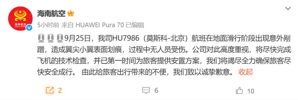 9月25日,就海航HU7986(莫斯科-北京)航班发生意外剐蹭一事,海南航空官微发布声明:HU7986航班在地面滑行阶段出现意外剐蹭,造成翼尖小翼表面划痕,过程中无人员受伤。
