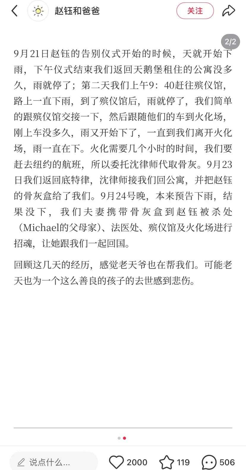 受害者赵钰的父母已经从中国紧急赶到美国,参加了女儿的遗体告别式,并准备带她的骨灰回国。