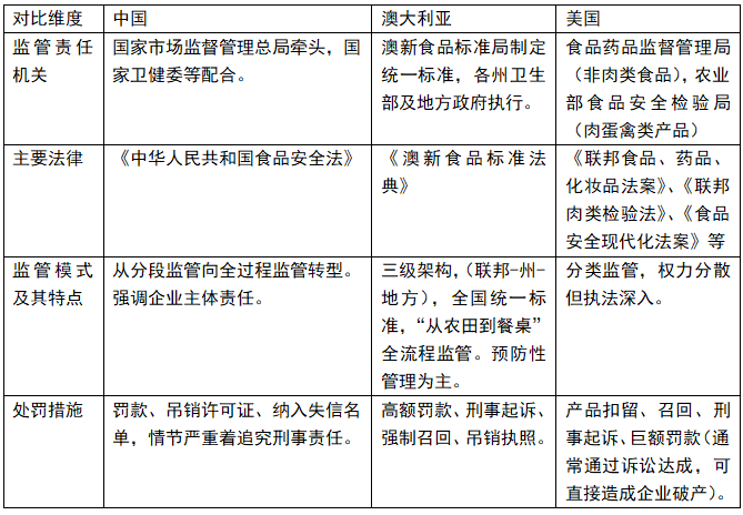 3、统一和冲突:美国监管体系依靠严格的法律法规、强大的执法能力(如USDA有权直接关闭不合格的肉厂)以及无处不在的产品责任诉讼文化,形成威慑。但多部门管辖可能导致重叠或空白。相较之下,澳洲模式标准统一,避免了美国式的管辖冲突;预防性原则使其在面对新兴风险(如新技术食品)时更为谨慎。