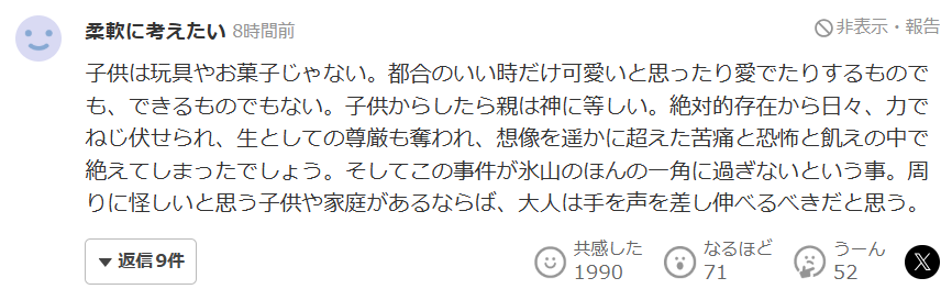 孩子不是玩具,也不是零食。不是在自己方便的时候才觉得可爱、才去疼爱,更不是可以随意对待的存在。对于孩子来说,父母就如同神一般的存在。在这样的绝对存在面前,他们每天被强行压制、剥夺作为人的尊严,在远超想象的痛苦、恐惧和饥饿之中逝去。而且,这起事件只是冰山一角而已。如果身边有觉得可疑的孩子或家庭,我认为大人们应该主动伸出援手、发出声音。