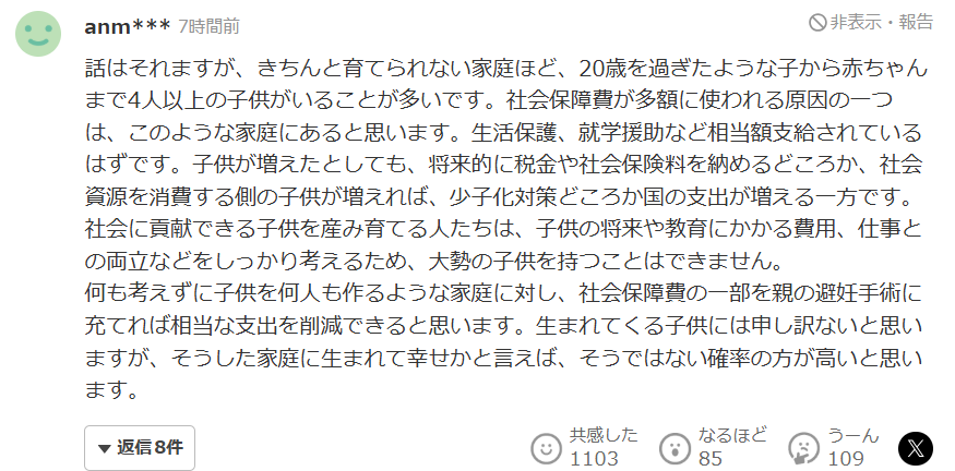 话题有点偏了,不过我发现,越是不能好好抚养孩子的家庭,往往孩子越多——从二十多岁的孩子到婴儿,加起来有四个以上的情况很多。我认为,社会保障费用之所以被大量消耗,其中一个原因就在于这类家庭。生活保障、就学援助等补助,应该都发放了相当数额。即便孩子数量增加,将来这些孩子不是缴纳税金和社会保险费的一方,反而是消耗社会资源的一方,这样不仅不能解决少子化问题,反而只会让国家支出不断增加。那些能够为社会作出贡献的孩子的父母,在生养之前,都会认真考虑孩子的未来、教育开支以及与工作的平衡,因此无法拥有那么多孩子。对于那些什么都不考虑就生很多孩子的家庭,如果把部分社会保障费用用于父母的绝育手术,我认为可以大幅削减支出。虽然对即将出生的孩子感到抱歉,但说实话,生在那样的家庭里是否幸福,可能更大的概率是否定的。