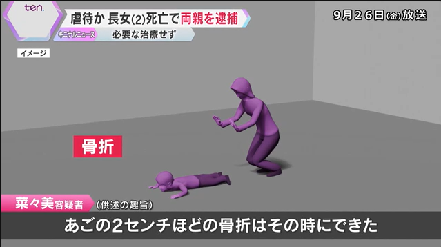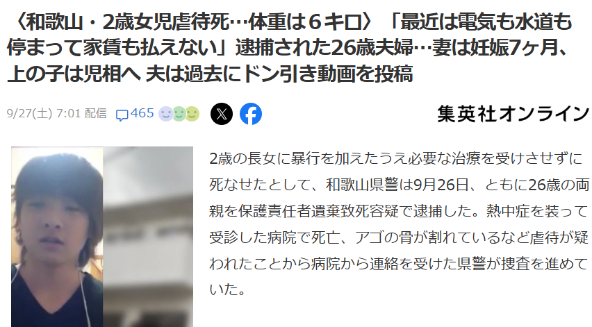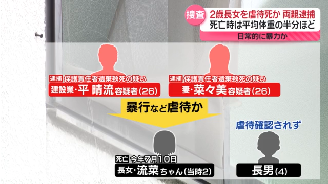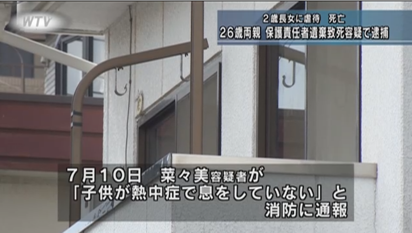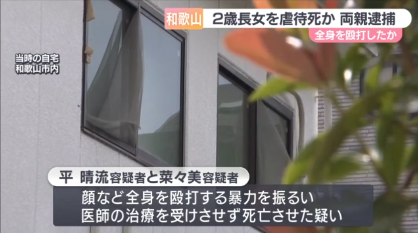 9月26日,和歌山县警方逮捕了这对26岁的年轻夫妇,指控他们对两岁的长女实施暴行,并未给予必要的医疗照护,导致孩子死亡,罪名为“保护责任者遗弃致死”。