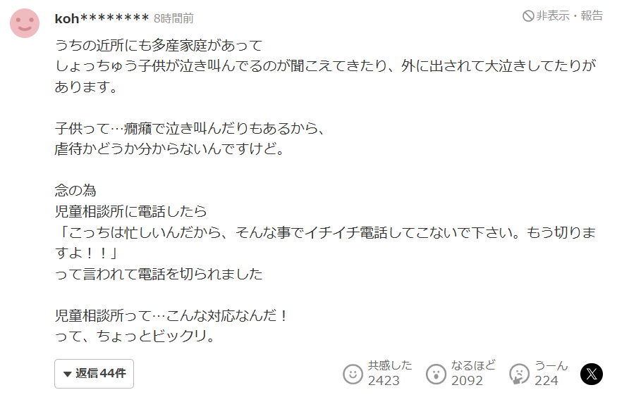 我家附近也有一个多子女家庭,我经常能听到孩子们在哭喊,有时候还被赶到外面去大哭。孩子嘛……有时候也会因为发脾气而哭闹,所以也不知道是不是虐待。为了以防万一,我给儿童咨询所打了电话,结果对方说:“我们这边很忙,这种事情不要一一打电话过来!我要挂电话了!!”然后就把电话挂了。儿童咨询所竟然是这种态度!我真的感到震惊!