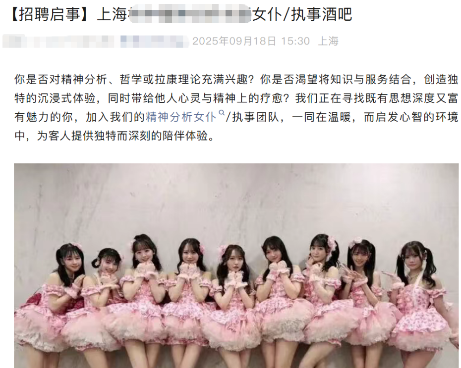 前不久,媒体也报道了上海一家女仆咖啡店打出招聘哲学、心理学专业员工的广告,希望有疗愈行业经验、具有精神分析领域知识的有志之士加盟。